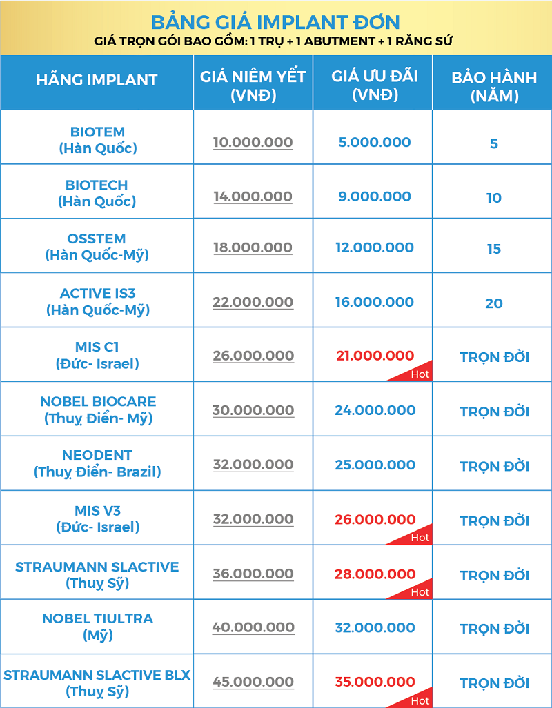 - Trồng răng Implant đơn lẻ chỉ từ 5 TRIỆU (gồm trụ, abutment và răng sứ)