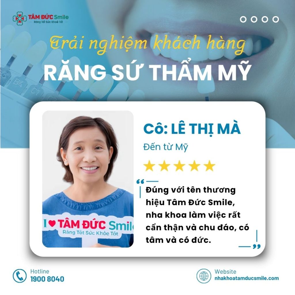 Qua lời giới thiệu của bạn bè, cô Lê Thị Mà từ Mỹ trở về Việt Nam để tân trang nụ cười tại nha khoa Tâm Đức Smile với mong muốn “vừa đẹp, vừa rẻ”. Và đúng như kỳ vọng, kể từ khi hoàn thành nụ cười mới tại Tâm Đức Smile, cô Mà đã có thể tự tin, vui vẻ sau nhiều năm gặp khó khăn trong việc ăn uống do sứt mẻ răng hàm dưới.\“Đúng với tên thương hiệu Tâm Đức Smile, nha khoa làm việc rất cẩn thận và chu đáo, có tâm và có đức.”