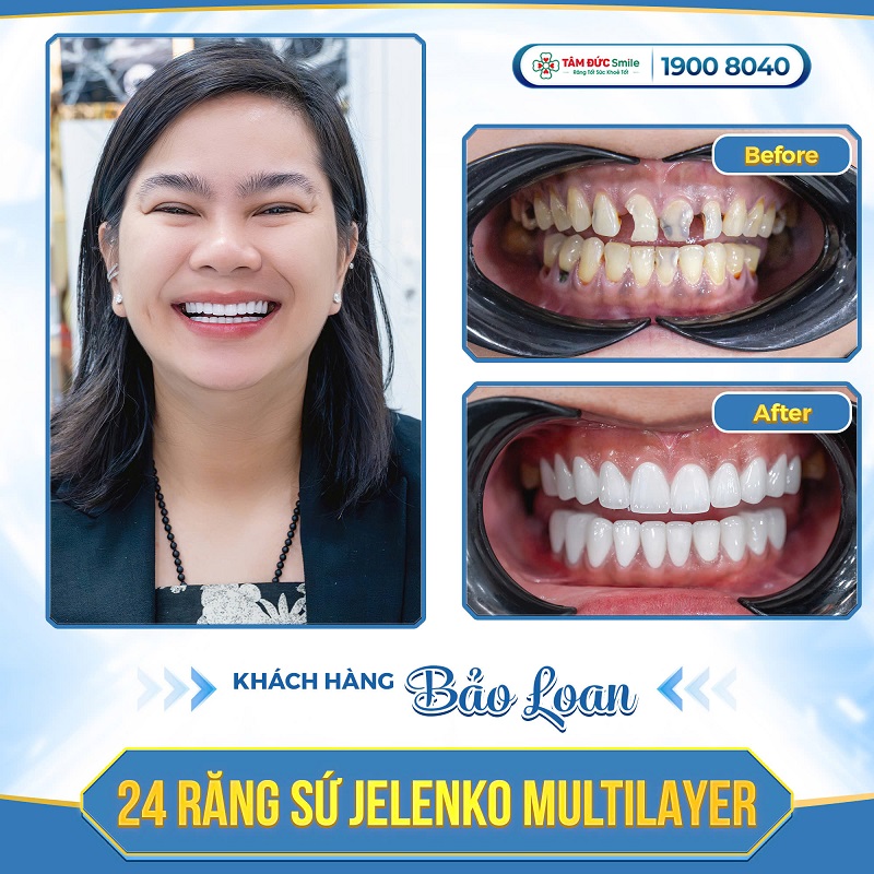 Chị Bảo Loan từng mất tự tin vì hàm răng mẻ, vỡ nặng, có đốm đen do sâu và lộ chân vàng, khiến nụ cười kém duyên và ngại giao tiếp. Sau khi tìm hiểu kỹ lưỡng, chị quyết định chọn Tâm Đức Smile để cải thiện nụ cười của mình bằng giải pháp bọc 24 răng sứ Jelenko Multilayer USA – dòng sứ cao cấp nhập khẩu từ Hoa Kỳ, có độ bền cao, không pha tạp chất, giúp ăn nhai thoải mái và duy trì độ trắng sáng tự nhiên. Sau 2 lần hẹn cùng bác sĩ, nụ cười của chị thay đổi hoàn toàn – trắng sáng, rạng rỡ và tự tin hơn gấp nhiều lần, mang lại cuộc sống vui vẻ và trọn vẹn hơn.