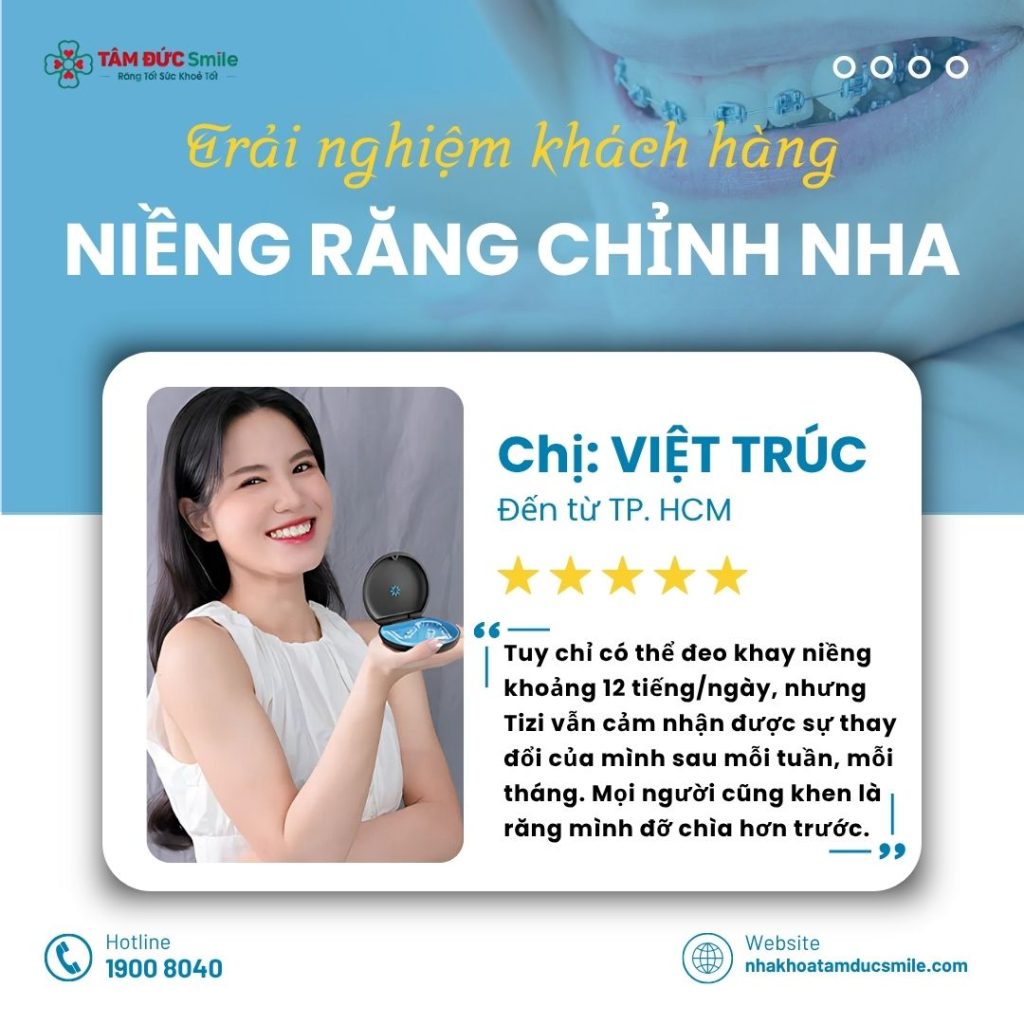 “Tizi đã niềng răng trong suốt tại Tâm Đức Smile được khoảng 2 tháng. Tuy chỉ có thể đeo khay niềng khoảng 12 tiếng/ngày, nhưng Tizi vẫn cảm nhận được sự thay đổi của mình sau mỗi tuần, mỗi tháng. Mọi người cũng khen là răng mình đỡ chìa hơn trước.”